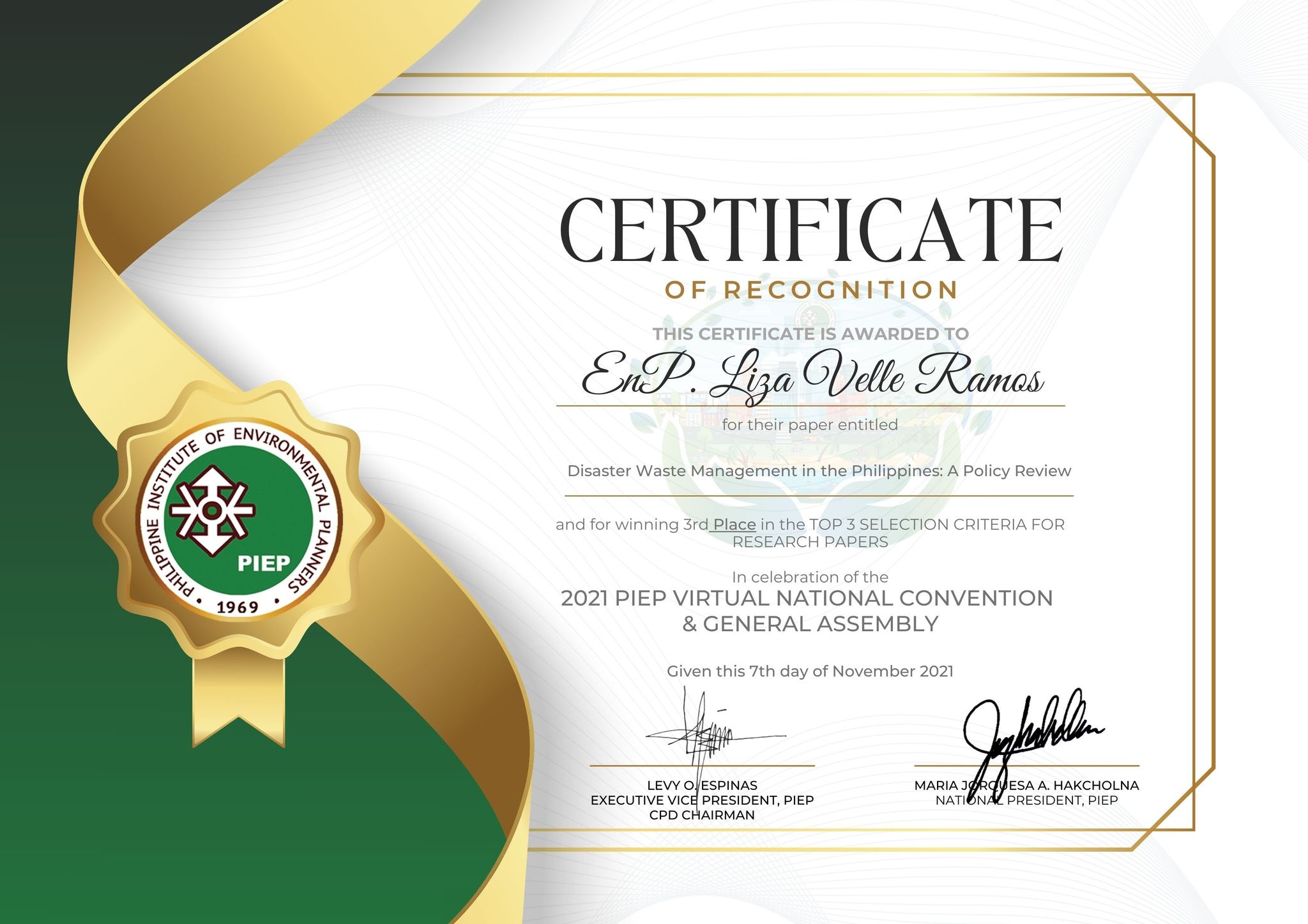 The group of Ms. Liza Velle Ramos, Dr. Noralene Uy, and Dr. Glenn Fernandez won 3rd place in the Best Paper competition at the Philippine Institute of Environmental Planners (PIEP) Virtual National Convention and General Assembly held on November 5-7, 2021. Ms. Ramos gave the presentation titled “Disaster Waste Management in the Philippines and in Makati” on behalf of the team.