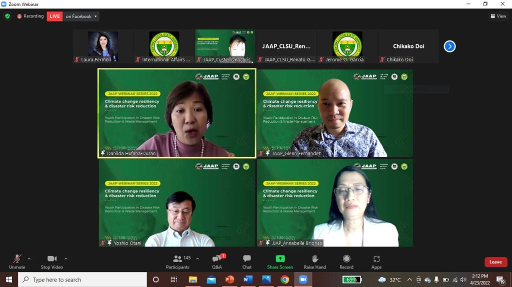 Dr. Glenn Fernandez, project leader, opened the 2022 Japan Society for the Promotion of Science (JSPS) Alumni Association of the Philippines (JAAP) Webinar Series with a presentation on April 23, 2022 titled “Youth Participation in Disaster Risk Reduction and Waste Management.” Dr. Fernandez was a 2015 JSPS HOPE Fellow.