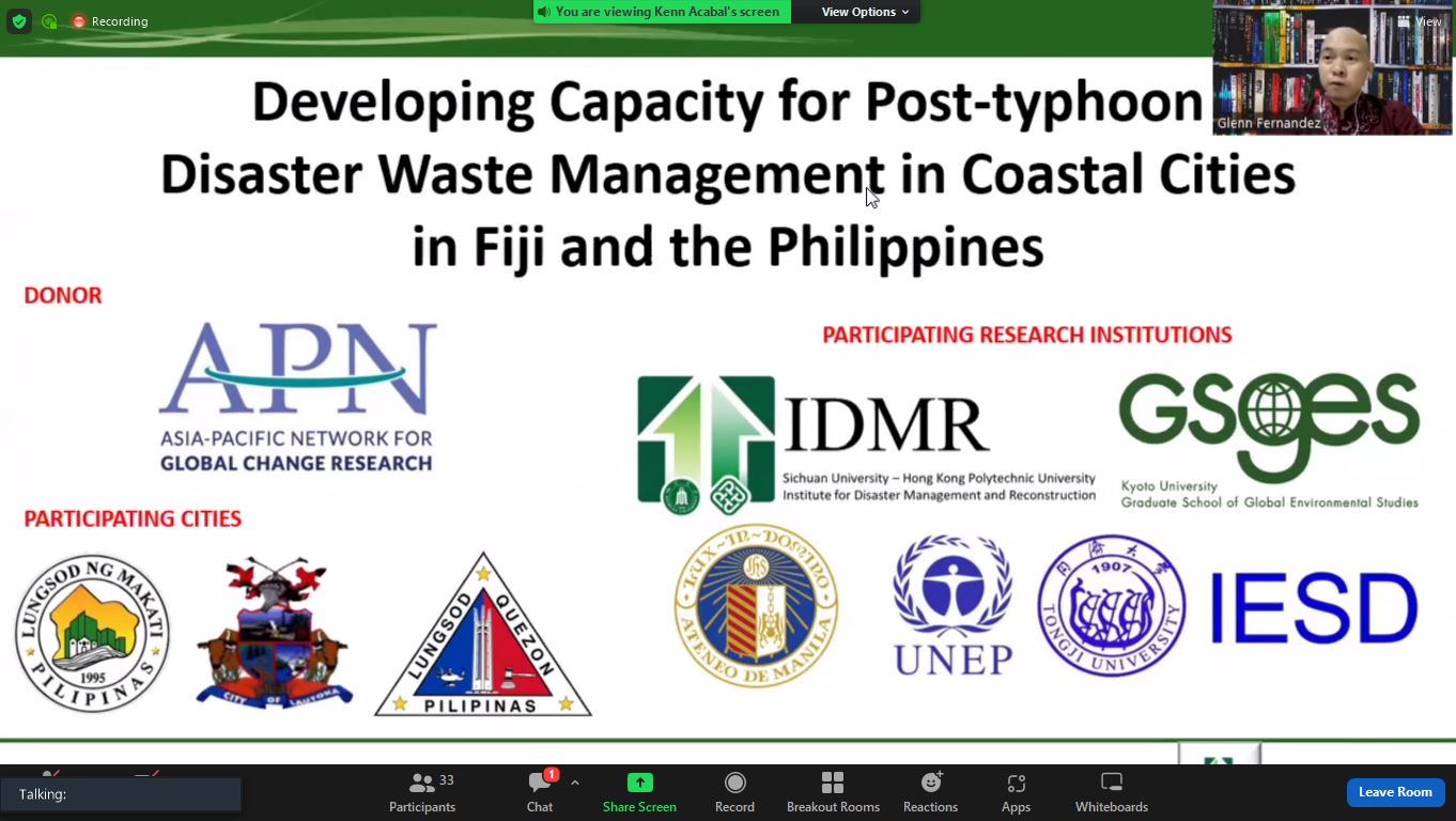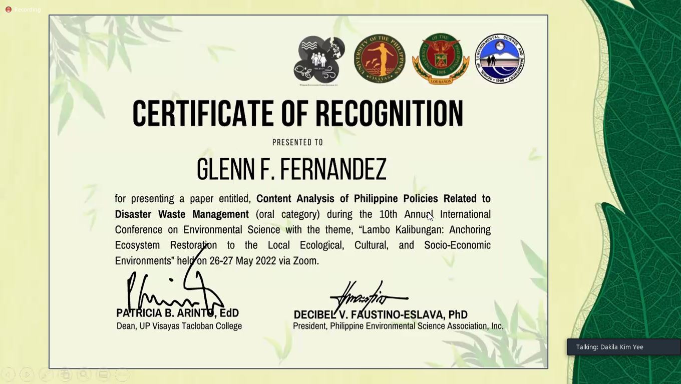 Dr. Glenn Fernandez, project leader, provided an encore presentation on “Content Analysis of Philippine Policies Related to Disaster Waste Management” on May 27, 2022 at the 10th Annual International Conference on Environmental Science (ACES) organized by the Philippine Environmental Science Association (PESA) and hosted by the University of the Philippines Tacloban. After the conference Dr. Fernandez applied for PESA membership.
