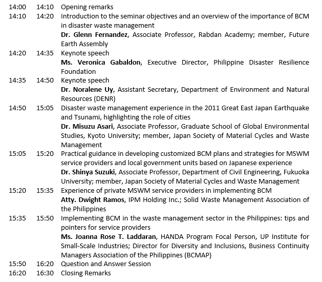 Disasters pose significant challenges to the effective management of municipal solid waste in the Philippines. Disruptions caused by disasters can lead to increased waste generation, inadequate waste collection and disposal systems, and environmental and public health risks. To mitigate these challenges, it is crucial for local government officials and municipal solid waste management (MSWM) service providers to have effective strategies in place to ensure the continuity of waste management operations during and after disasters. Business Continuity Management (BCM) provides a framework for identifying potential risks, developing strategies to minimize disruptions, and ensuring the swift recovery of essential services. This seminar aimed to introduce and promote the application of BCM principles and practices among local government officials and MSWM service providers in the Philippines, specifically in the context of disaster waste management. The seminar was organized by the City of Makati and the Philippine Association for Disaster Waste Management (PADWM), with additional funding from the International Network for Government Science Advice – Asia Chapter (INGSA-Asia).