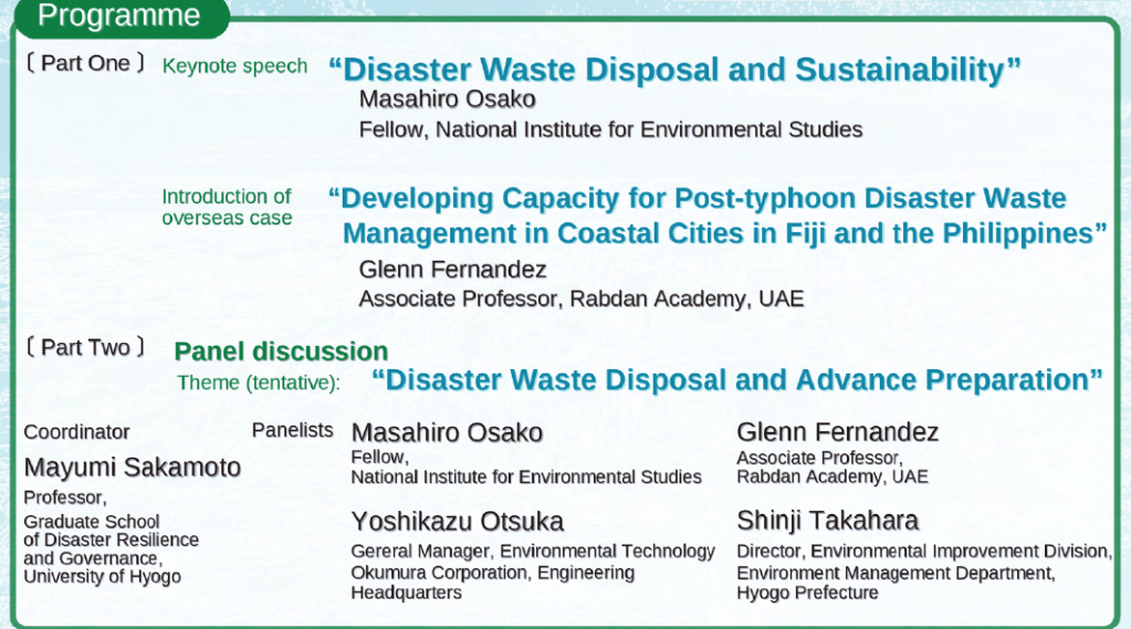 Dr. Glenn Fernandez, the president of the Philippine Association for Disaster Waste Management, has been invited to present an overseas case study titled “Developing Capacity for Post-typhoon Disaster Waste Management in Coastal Cities in Fiji and the Philippines” at the SDGs International Forum 2024 organized by the Hyogo Prefectural Government, Asia-Pacific Network for Global Change Research (APN), Institute for Global Environmental Strategies (IGES), and Hyogo Safety Day Promotion Council. The forum is part of the commemoration of the 30th Anniversary of the Great Hanshin-Awaji Earthquake.